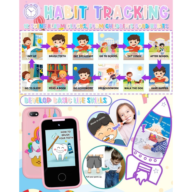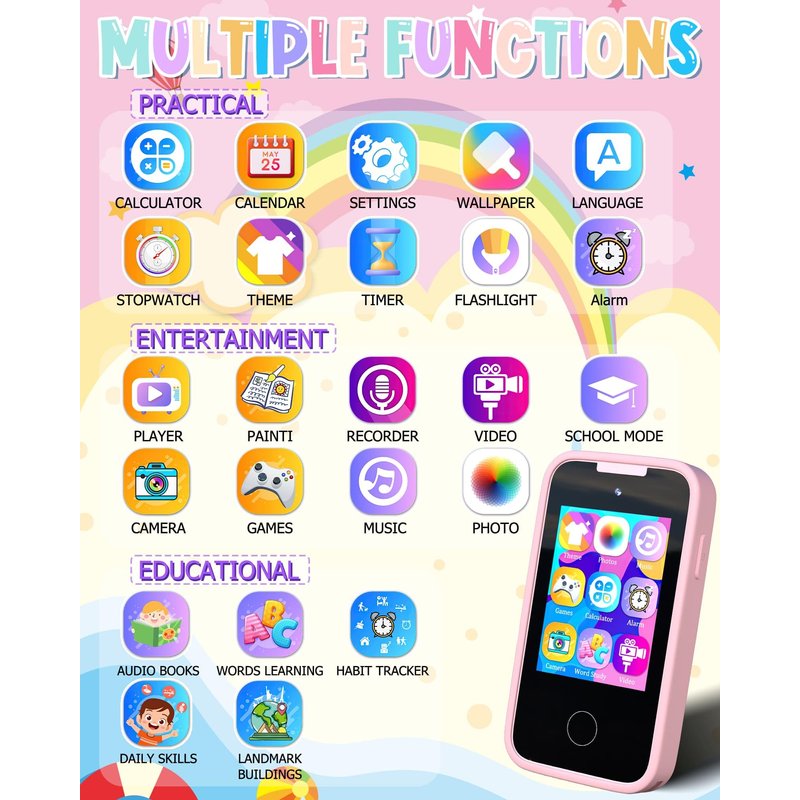 - 【ALL IN ONE KID'S SMART PHONE】: With 23 entertainment, educational, and practical functions including games, drawing, music, taking photos, letter cards, habit tracking, audio books, calendars, etc., this smart cell phone meets all kids’ needs. School mode allows parents to control playtime. Kids can customize the phone from 31 wallpapers and 11 themes.