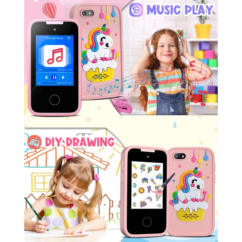 - 【DURABLE AND SAFE】:It includes a USB-C cable for charging, and the 600mAh battery can be fully charged in 2h, providing up to 5h of continuous use. This kid's smartphone is made of ABS safety material. The unicorn thick silicone phone case offers protection against drops. The lanyard allows for easy carrying and helps prevent loss.
