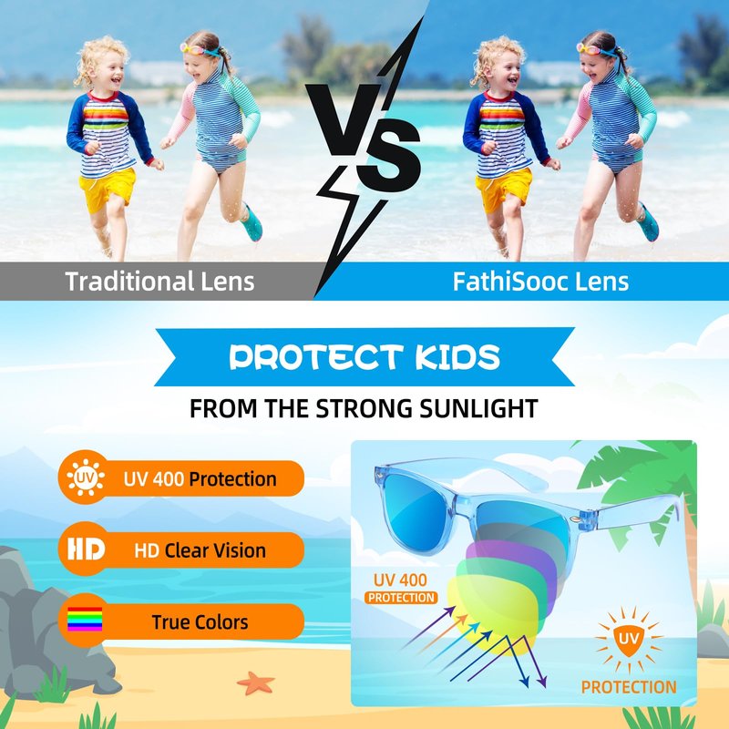 - 【UV 400 Eye Protection & Polarized Lens】The polarized lenses of these kids sunglasses can maintain clear vision and natural colors, reducing the fatigue state of kids' eyes. It's perfect for summer beach pool parties and all outdoor activities. Also, our lenses are very colorful, and when combined with the translucent frame, it makes kids the center of attention at any party or place!