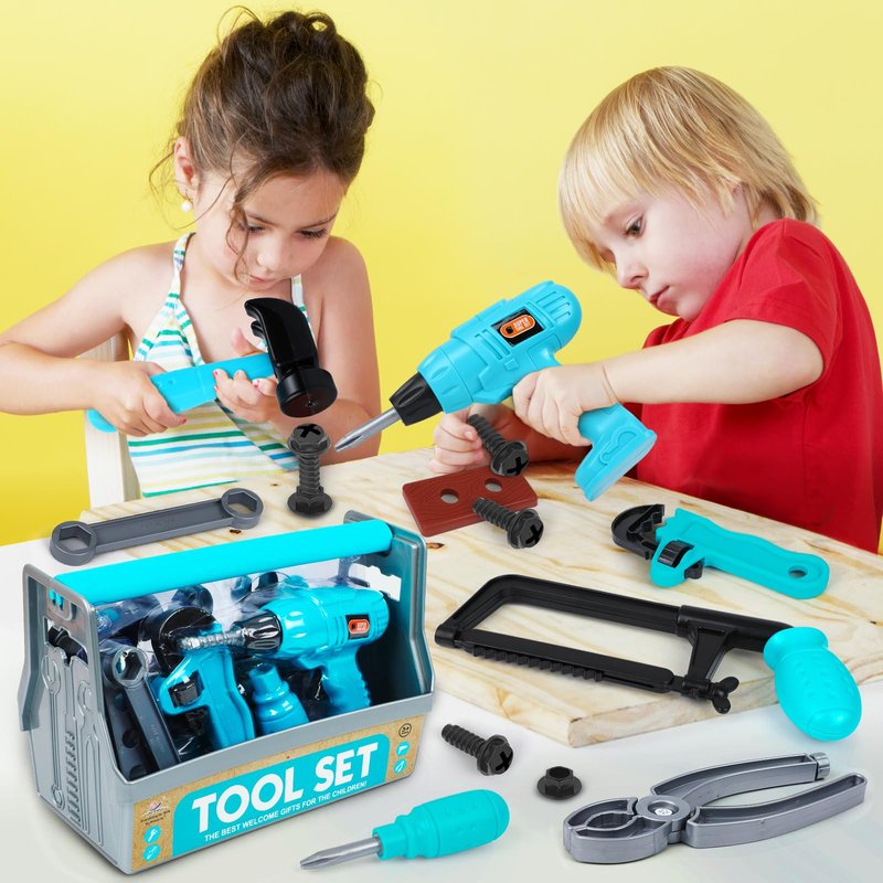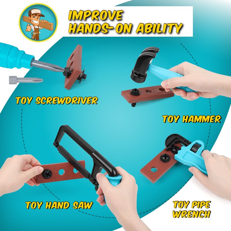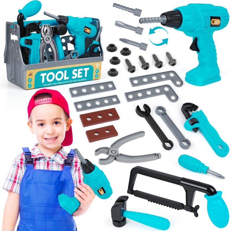 - Pretend Tool Toys for Kids: This blue kids tools kit includes friction drill, hand saw, pipe wrench, hammer, pliers, 2 wrench, screwdriver handle, 4 bolts and 4 nuts, 6 play boards, 3 drill bits (also can be screwdriver heads), and toy toolbox.