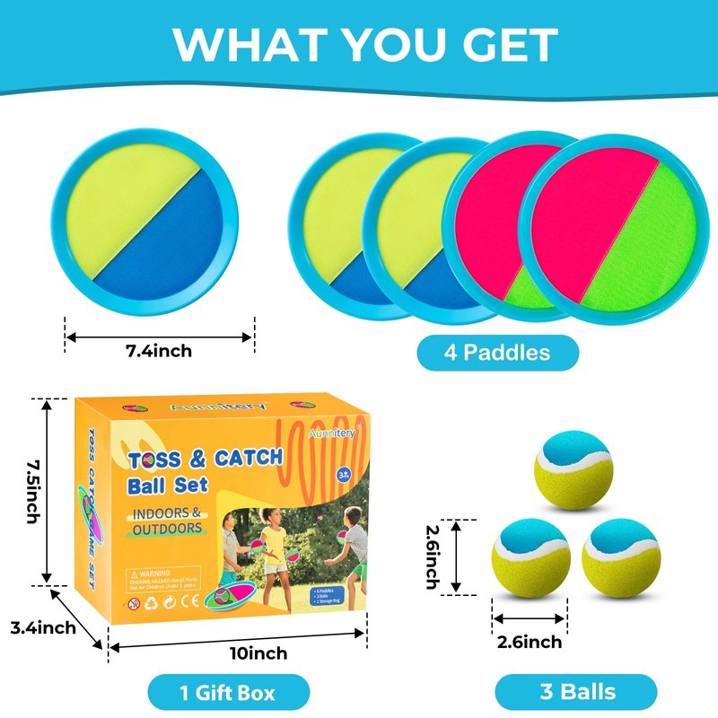 - Funny Toss and Catch Ball Games: Our beach toys for kids 8-10 include 4 paddles and 3 balls, 1 exquisite storage bag. It is easy to play, one side throws the ball and the other catches the ball. This game can be played by 2-4 people, which is flexible and funny to bring both kids and adults together to play the game.