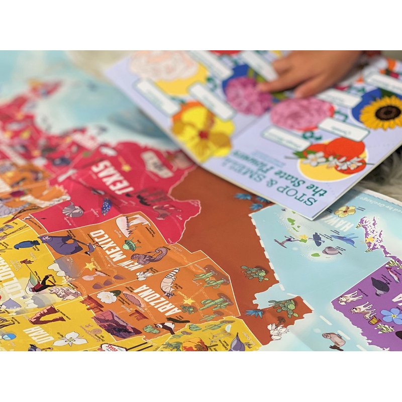 This fun and educational geography bundle includes a HUGE USA ILLUSTRATED MAP, a card deck for GAME PLAY, and a learning ACTIVITY BOOK to keep the whole family excited, engaged and learning! Ages: Ideal for ages 5 to 12 year old's and fun for the entire family! Number of Players: 1 to 6 players based on game. Gather your friends and family and get ready to learn about our great country. Our exquisitely detailed map and card deck presents each State's Capital, Flower, Bird, Animal and a Special Landmark. You'll be able to locate, learn and quiz each other on how much you remember. The Activity Book: Learn, Explore, & Play A Trip Around the USA by GeoJango The impressive 25-page Activity Book is beautifully illustrated. It includes fun activities to keep the whole family challenged. You’ll discover more details about your specific home State, practice your seeking skills by finding details on the map, match States to their capitals