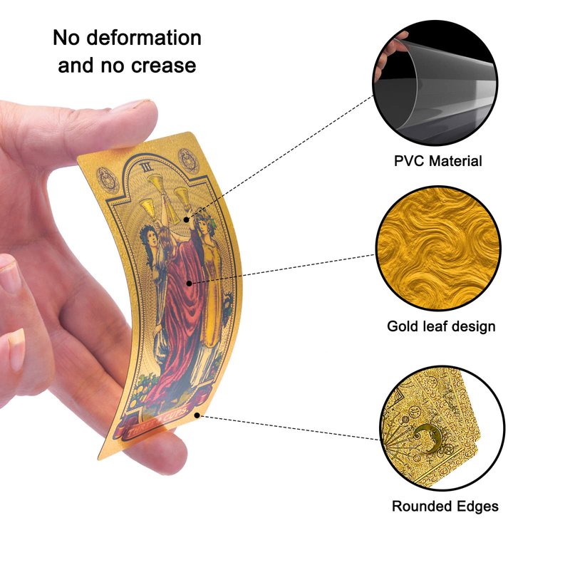 Our tarot cards are perfect for beginners.The tarot deck package comes with a detailed booklet that offers an easy-to-read explanation for players.The tarot color is gold, and each piece looks as good as gold leaf, making this tarot deck look very high-end. Perfect for your collection.So If you are looking for the ultimate gift for game lovers, then you have found our playing tarot deck.The gold design makes everything pop and helps the focus into the card. Bring a different experience to users. Now let's enter the world of tarot cards.