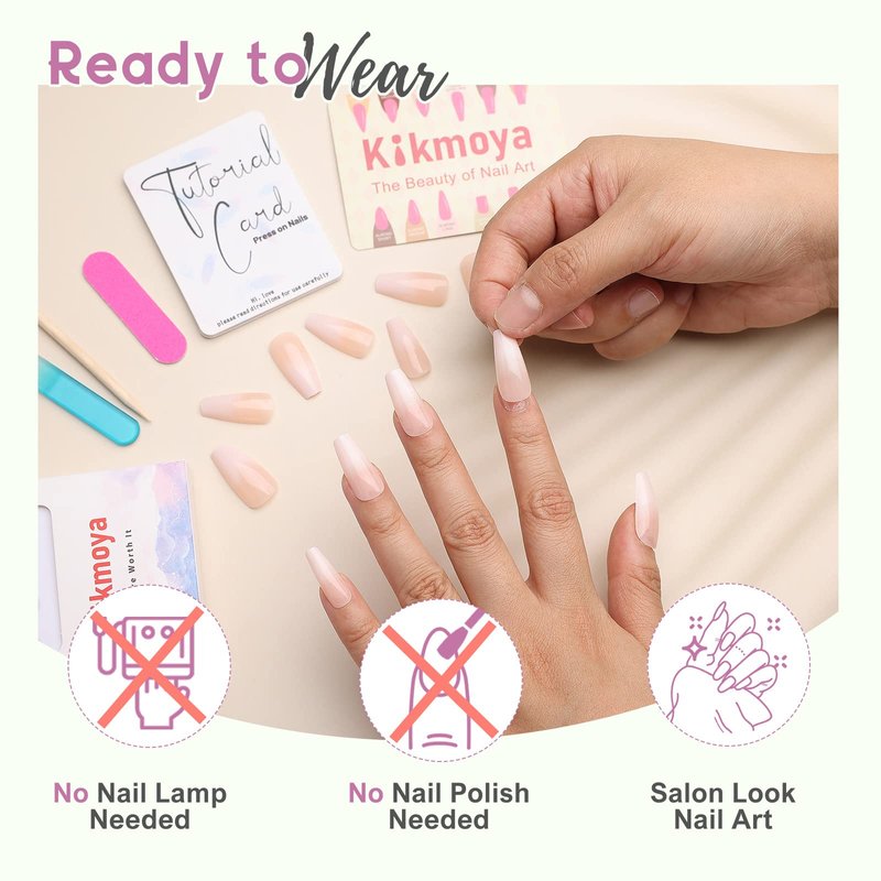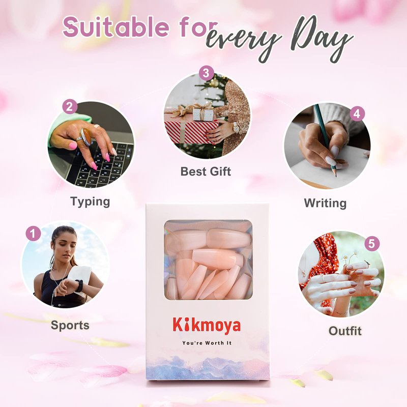 Kikmoya Pink Press on Nails Medium Length with Ombre Design Coffin False Fake Nails 24pcs French Ballerina Long Glossy Stick on Nails for Women