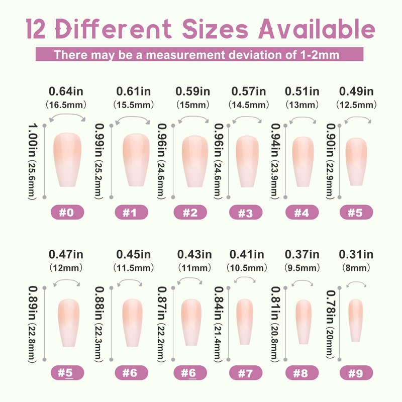 - PACKAGE CONTATINS - You will get 24pcs ombre pink press on nails in 12 different sizes + 1 Cuticle Stick + 1 Nail File + 1 Sheet Nail Stickers + 1 Instruction Manual (Using our false nails with glue last longer. Using our press ons with stickers will be more convenient, there is no glue in the package, only stickers.)
