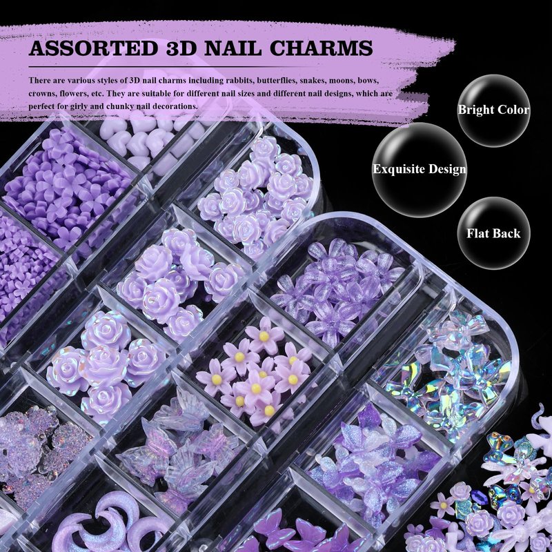 Kikonoke 2 Boxes 3D Flower Nail Charms Butterfly Bow Snake Rabbit Bear Shaped Nail Art Rhinestones Gems for DIY Nail Art Decoration Making Craft (Purple)