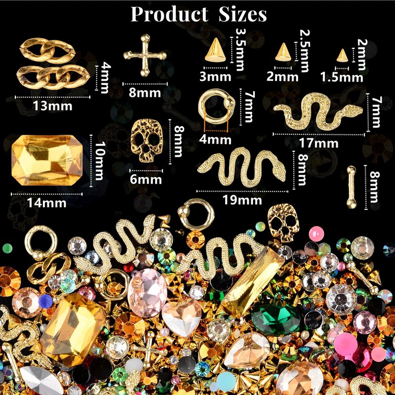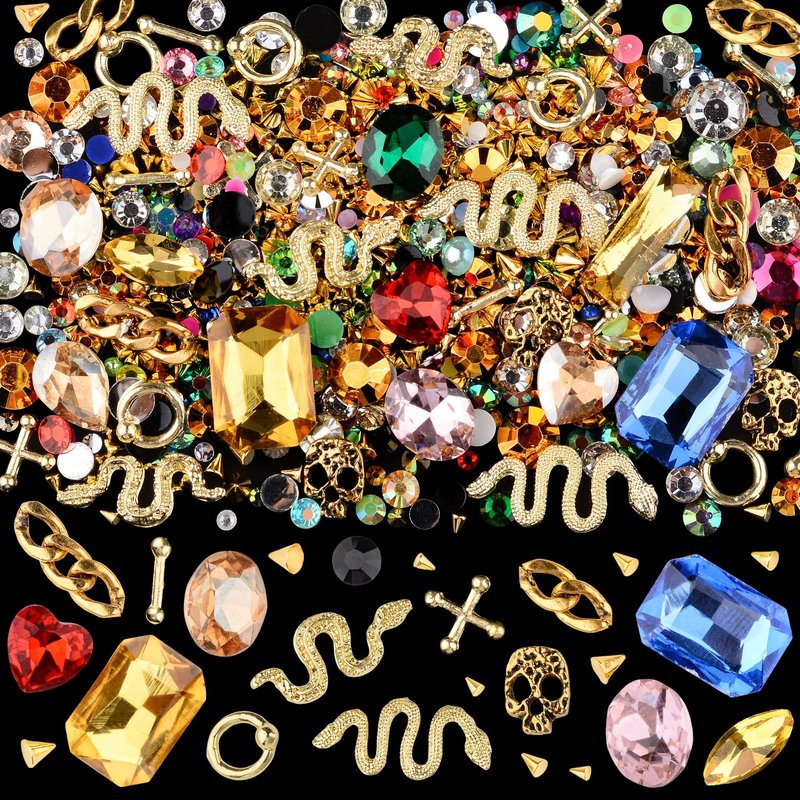 Kikonoke 300 Pcs Cone Rivet with 3D Metal Skull Cross Chains Snakes Vintage Alloy Nail Charms Glass Pointed Bottom Gems and Resin Rhinestones for Women Girls Metal Nail DIY (Gold)