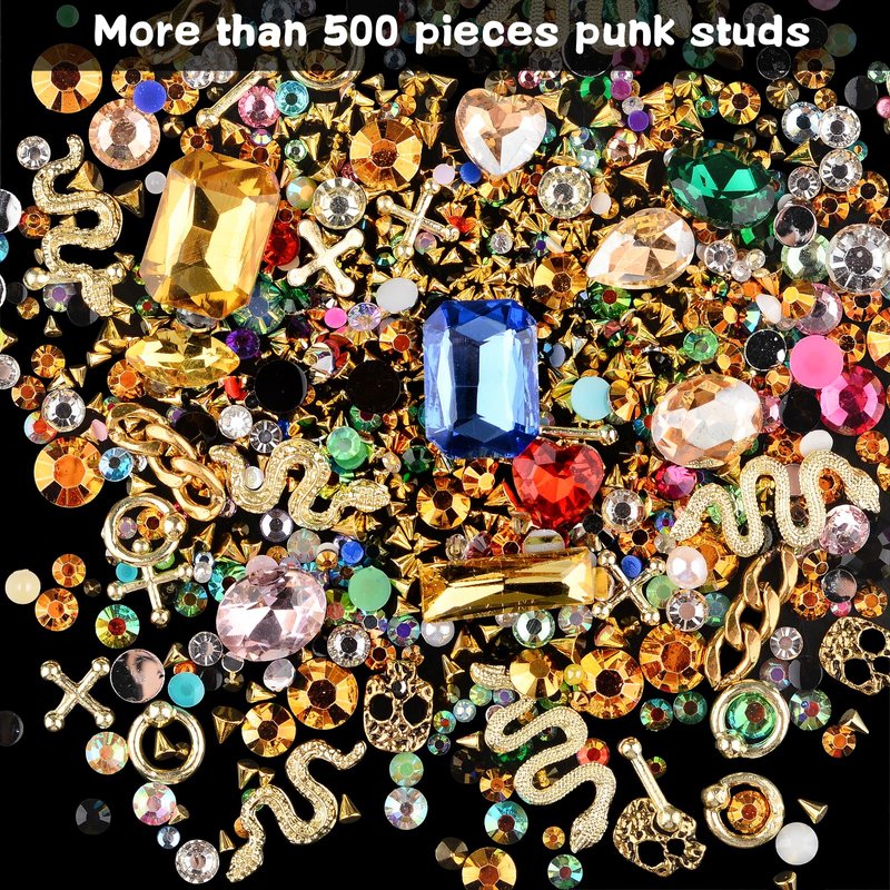 300 Pieces Gold Rivets Cool Skeleton Gemstone Kit with 200 Pieces Rhinestones for Nail Art DIY