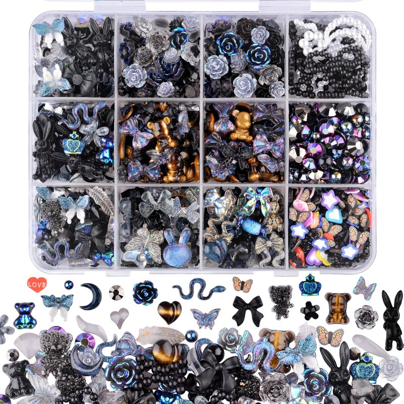 Kikonoke 850 Pieces 3D Butterfly Rose Flower Bow Rabbit Bear Nail Charms Kit with Nail Art Rhinestones Pearls Crystal Gems Nail Slices for Manicure DIY Crafts Jewelry Accessories (Black)