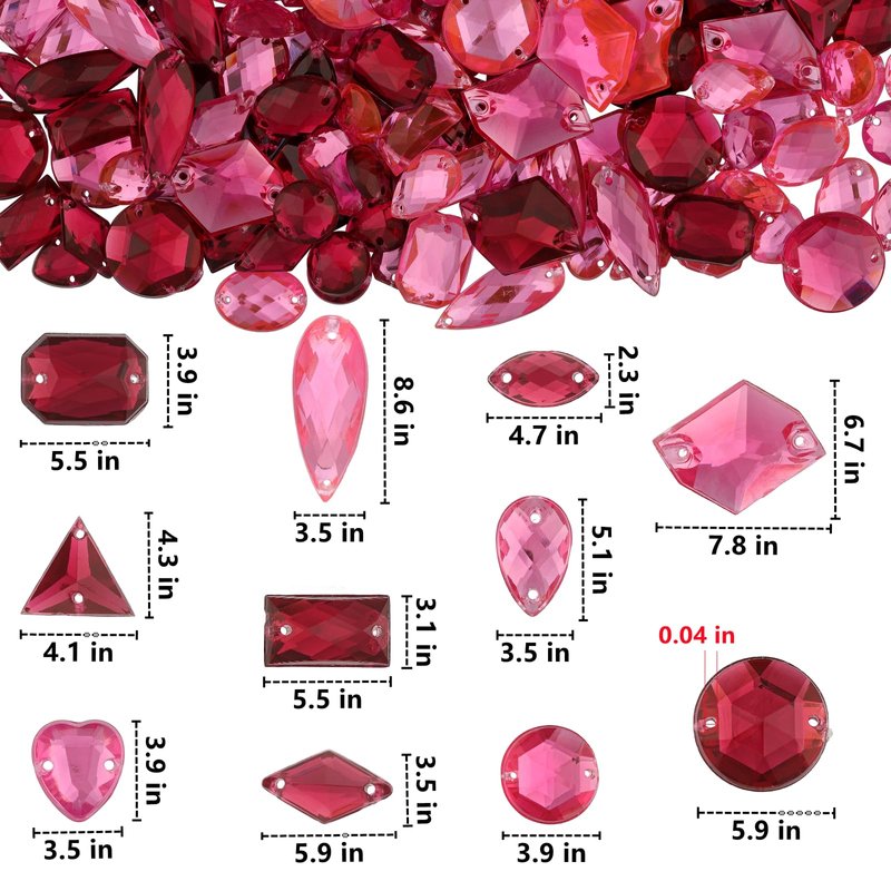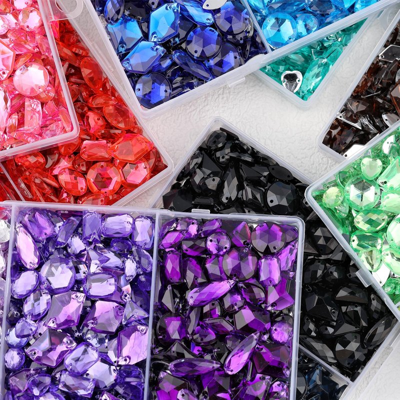 - You Will Get: A box of about 950 sewing rhinestones. This flatback acrylic sewing gems set mixed more than 3 colors and 9 shapes, ranging from 0.4~0.9 inches in length, 0.23~0.7 inches in width, and about 0.15 inches in thickness.