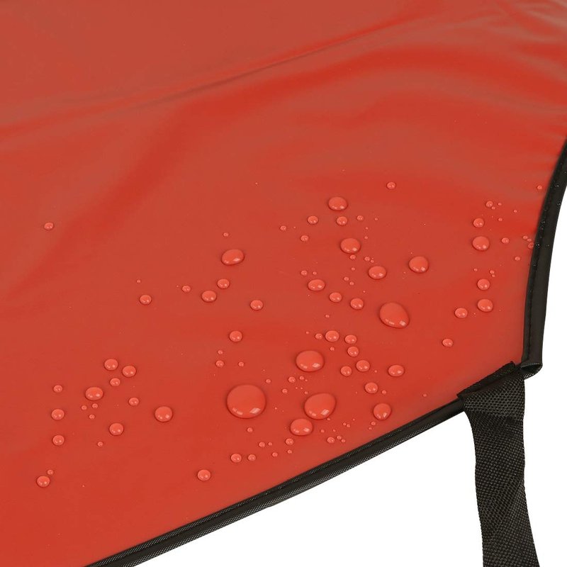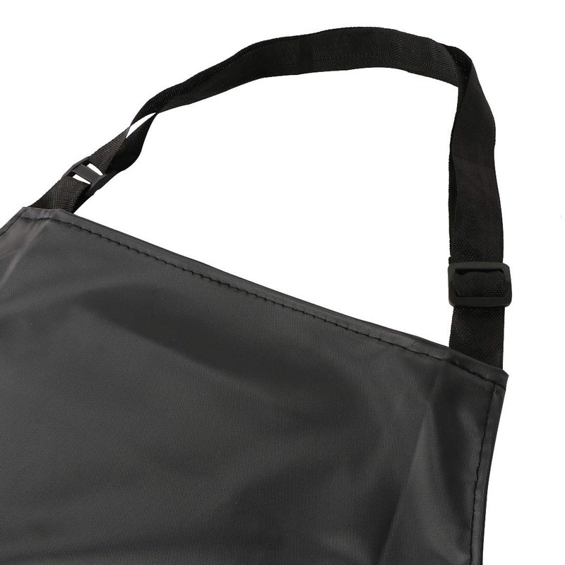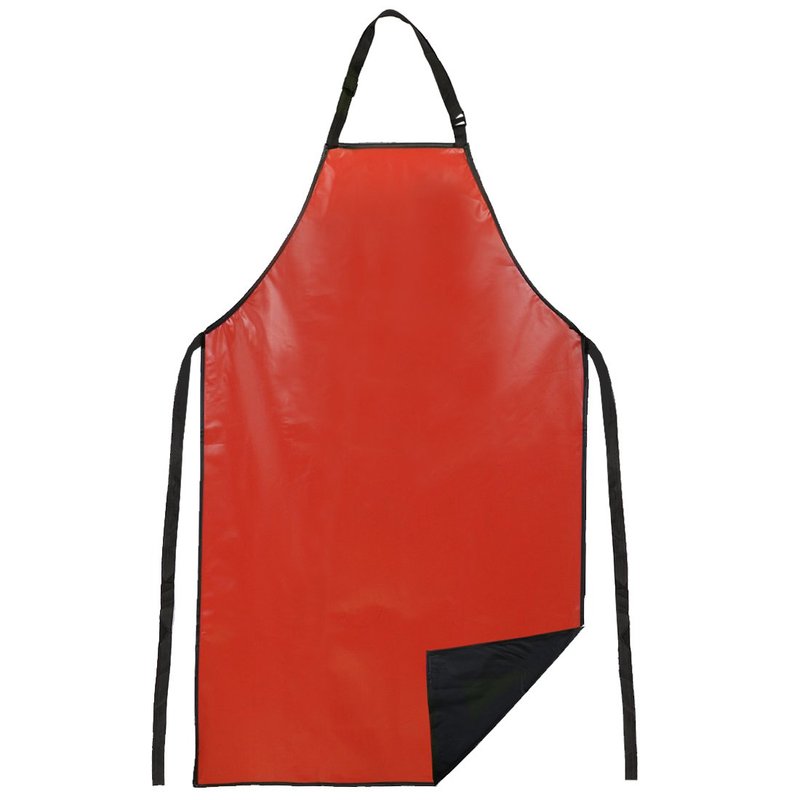 Waterproof material - Front side of the apron is made of high quality, water resistant nylon (in black); Back side is made of waterproof vinyl / PVC (in red)