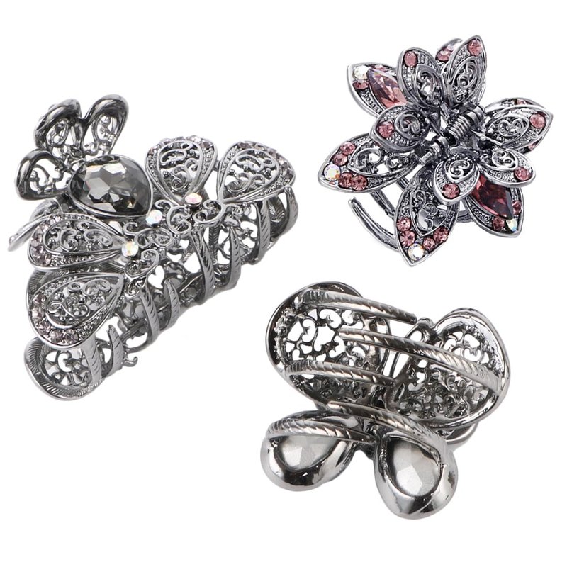 This set includes 3 rhinestone claw clips of different designs as shown in images.