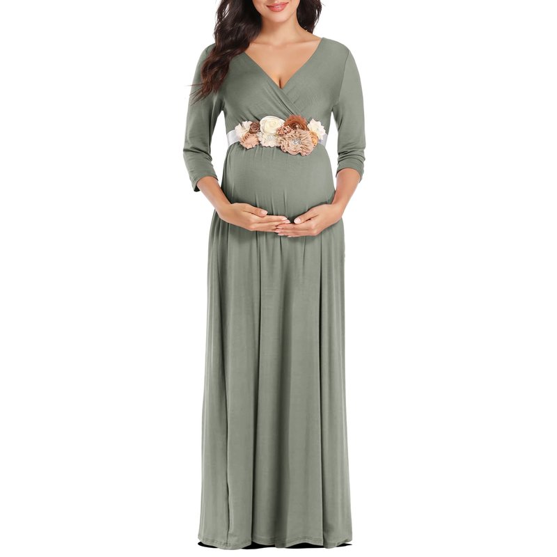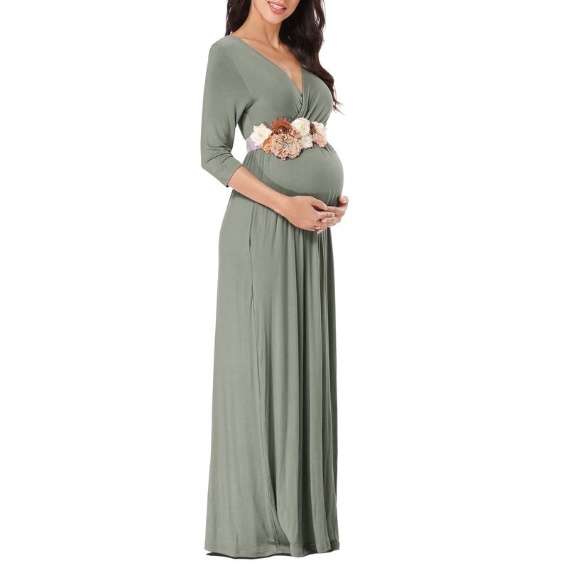 KIM S Maternity Dress Maternity Dress for Photoshoot Maternity Photoshoot Dress Baby Shower Dress Maternity Maxi Dress Boho Maternity Dress Fall Maternity Dress (Grey Green L)