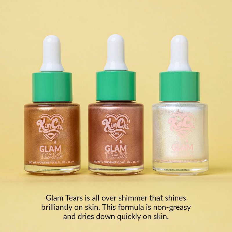 Glam Tears is an all over shimmer that shines brilliantly on skin. Glam Tears in Opal is a liquid pearlescent shimmer that is perfect for looking like you're dripping in diamond & pearl dust. KimChi Says: "Do you ever have one of those days where you just look out the window and wonder about the meaning of life? Then you feel a tear dropping down from the corner of your eye? Yeah me neither. However, you drop these glam tears anywhere you want on your face and body for a long lasting, glittery highlighted finish! I promise you won't be crying ever again!"