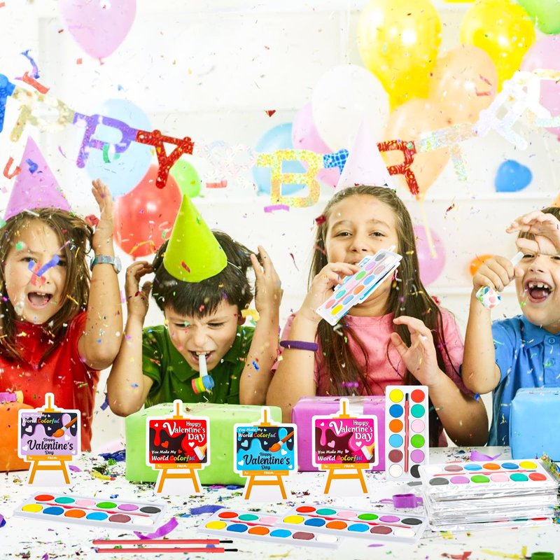 - Valentines Day Gifts Set: Package includes 24pcs easel shape Valentine's exchange cards in 4 different designs,24 pcs watercolor paint with 12 different colors and 25pcs transparent seal bags.Sufficient quantity will meet your different gift demands.