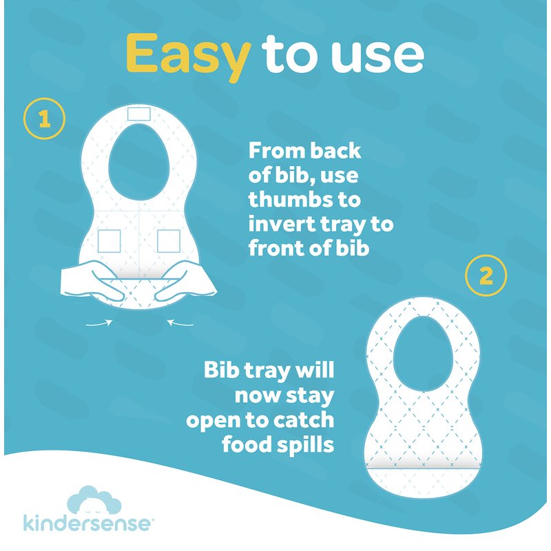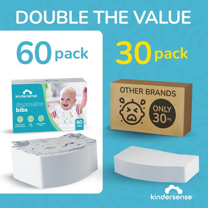 Kindersense Disposable Baby Bibs for Feeding and Drooling 60 Count Travel Bibs for Baby Toddler Child Boys Girls Absorbent and Leakproof 60 Count Disposable Bibs Baby DISPOSABLE AND CONVENIENT Pack of 60 fully functional baby bib and conveniently compact and disposable. Store them around the house, or in the pocket of a high chair. Can be used for feeding, eating, or drooling. A DIAPER BAG MUST The perfect baby travel accessory - Have a baby bib available at any given moment! Folds to a compact 7 x 4.75 inch and opens to a large 13.5 x 8 Inch - Store in a diaper bag, a car, or any place you may need a bib. ADJUSTABLE and FUNCTIONAL Features adhesive strips on the neckline to adjust to any baby’s neck size, and have optional adhesive strips on the backside to keep bib in place. Suitable as newborn bibs, baby bibs, or toddler bibs. LARGE FOOD CATCHING TRAY Includes a large bib tray that stays open and catches spills. Invert the tray from the back of the bib and the tray will remain open. ABSORBENT AND LEAK PROOF 3-Layer construction featuring a soft top layer, an absorbent middle layer, and a waterproof bottom layer making these fully waterproof yet absorbent. Backed by our SATISFACTION GUARANTEE!