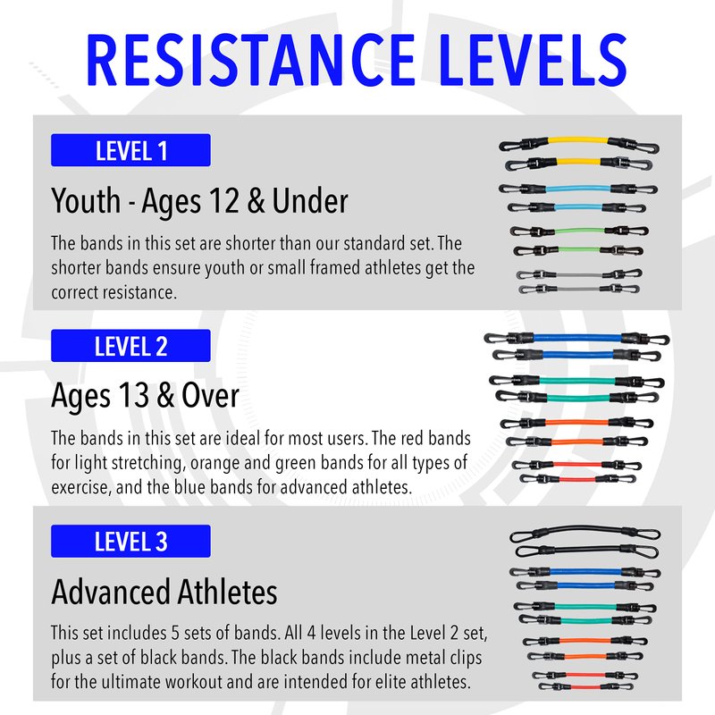 - Speed bands training worldwide - Athletes of all ages (7+) and abilities use Kinetic Bands to improve speed & agility, sport-specific skills, and athletic performance in many different sports as well as general fitness training. Resistance Band Levels by Kit (Lowest to Highest): Level 1/Youth (Grey, Light Green, Teal, Yellow), Level 2/Intermediate (Red, Orange, Green, Blue), Level 3/Advanced (Red, Orange Green, Blue, Black)