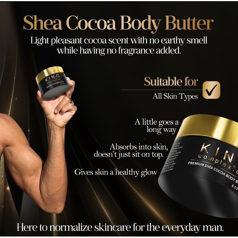 Good for hands, elbows, knees, and feet, This ultra rich buttery textured body butter doesn't just sit on top of the skin but absorbs into the skin. All King complexion products are specially formulated with premium ingredients for all skin types especially melanin rich skin. This butter has a deep moisturizing feeling that's not too greasy with a light cocoa scent and no Earthy smell. King complexion is here to normalize skincare for the everyday man. Your disappointment of body butters that don't work stop here.