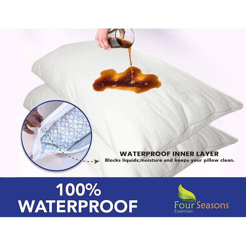 - WATERPROOF: Whether you have pets or kids, accidents and spills happen. This 100% waterproof pillow protector has a polyurethane inner lining that blocks liquids and moisture from getting in and keeps your pillow waterproof, dry and protected!