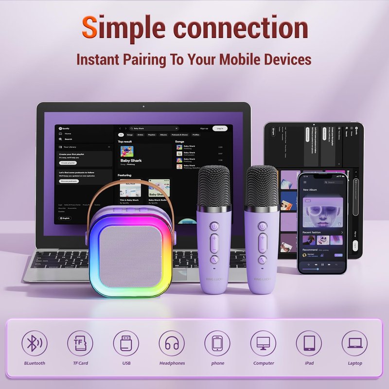 - Versatile Karaoke Machine for Kids: This portable karaoke machine offers three ways to play. Advanced Bluetooth 5.3 transforms it into a wireless speaker, so you can enjoy dynamic music from your phone. Alternatively, insert a TF card to play music directly, no streaming required. With two microphones, you're always ready to start singing, anytime, anywhere