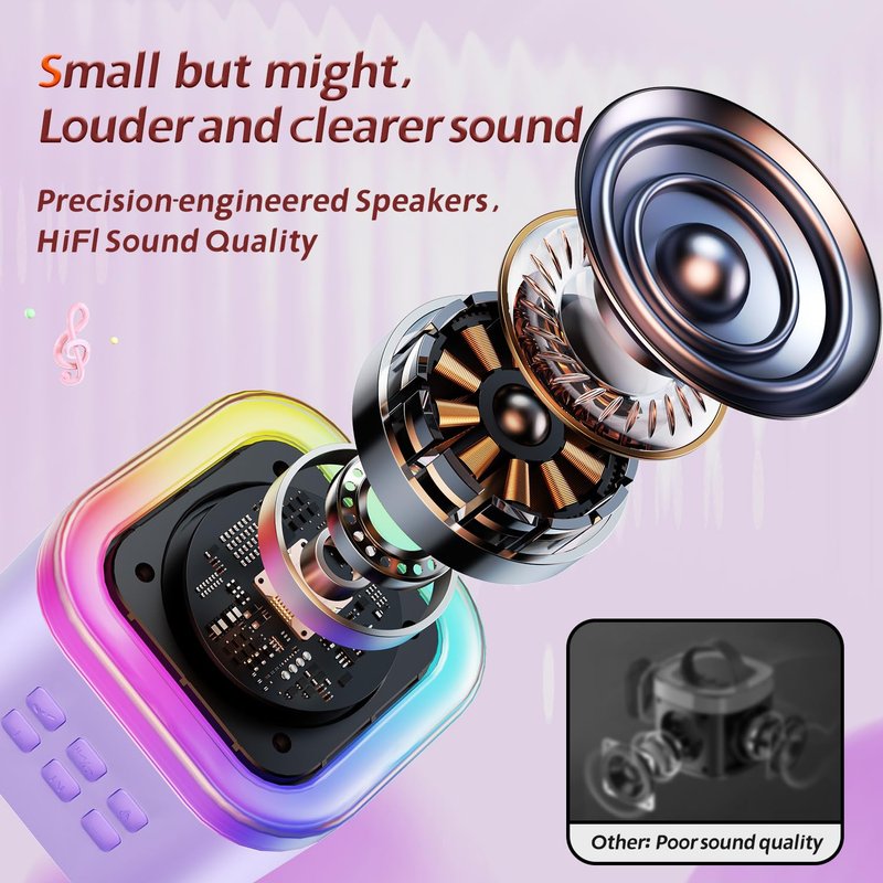 - HiFi Sound Quality: Equipped with a bass diaphragm and digital signal processor, this karaoke machine delivers rich, crystal-clear sound with deep bass, bringing every note and beat to life. The karaoke machine further enhances sound quality by minimizing noise and interference. (Note: To prevent howling, avoid placing the microphone too close to the speaker when the volume is high