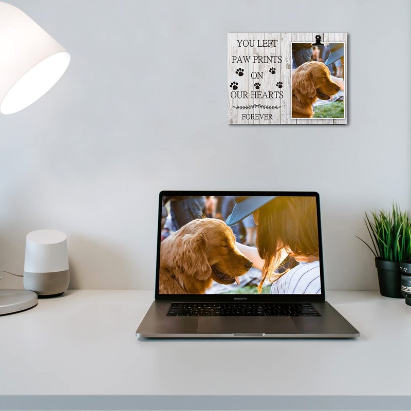 - Tabletop/Hanging memorial frame: This dog bereavement picture frame has folding easel back for tabletop display, and a hanger to hang the frame on the wall.