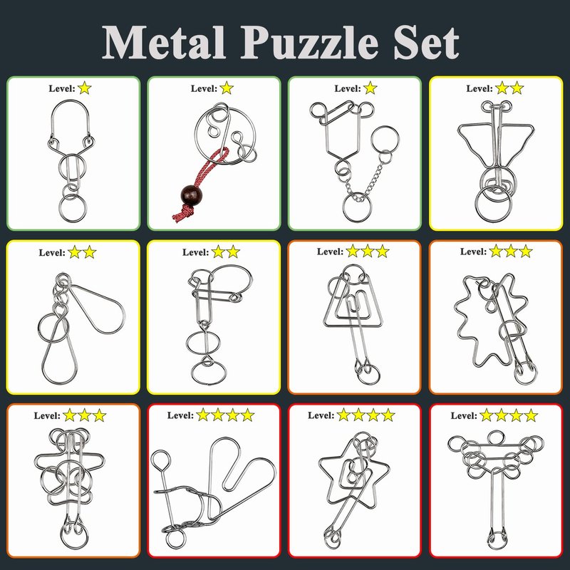 - METAL PUZZLE SET - This metal brain puzzle set contains 12 different metal puzzles, it is an amazing set of Intellectual toys. This puzzle game is specially designed to disentanglement, they may look simple but contain lots of mysteries, when you disassemble it, you must face another challenge to assemble it.