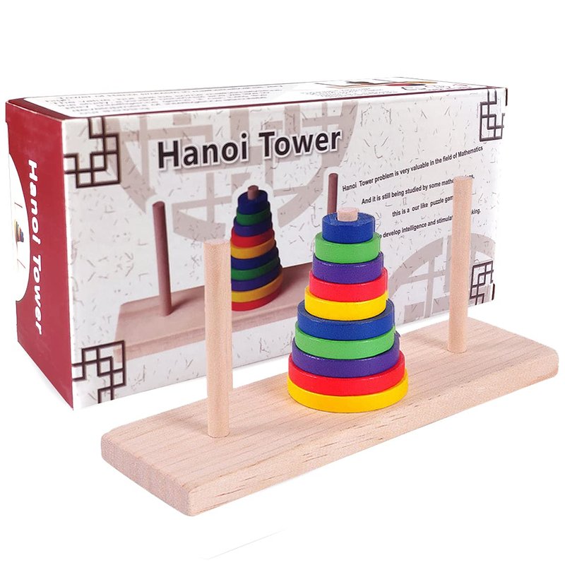 This tower of Hanoi consists of three rods and seven round disks of different sizes and a board. The objective of the puzzle is to move the entire stack to another rod, you are allowed to move one piece at a time and are only allowed to place a smaller piece on top of a larger piece. The 10 Rings version requires 1023 moves.