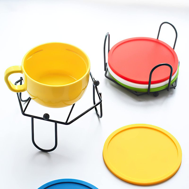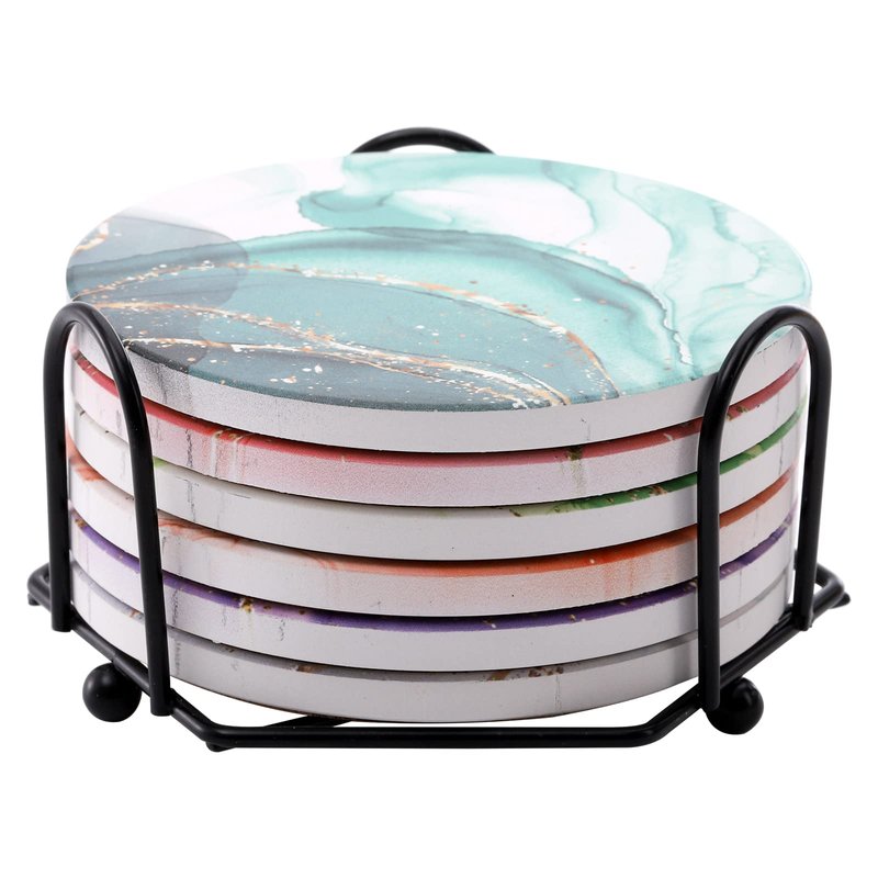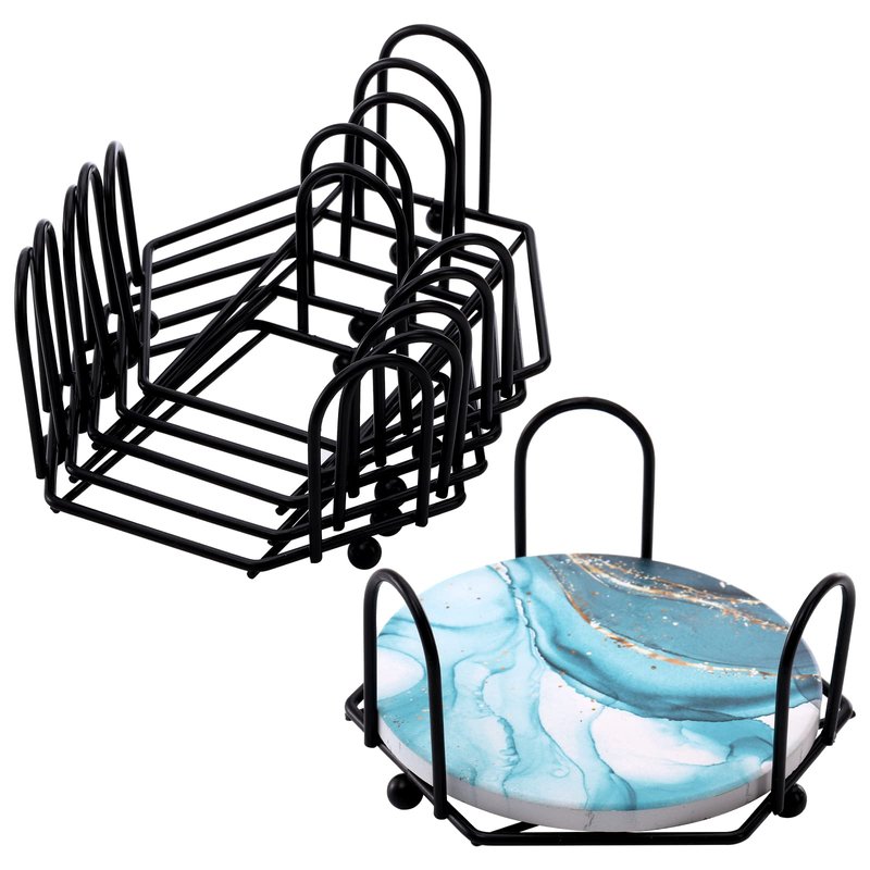 - Black metal goes with any coaster set. No more worrying about matching your decor, this coaster holder will compliment any set of coasters you want to put in it.