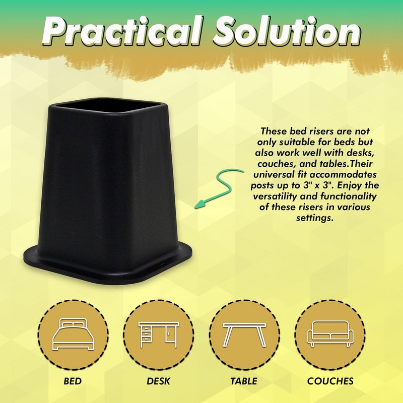 - MATERIAL & SIZE: The pack of 4 furniture leg risers is built from premium plastic material, which can stand the weight of the heaviest furniture in your home, office, or anywhere. These leg risers for furniture provide an additional height of 5.25 inches. Our riser size is 3 inches in width and 0.78 inches in depth from the top, which is the perfect size for any bed frame.