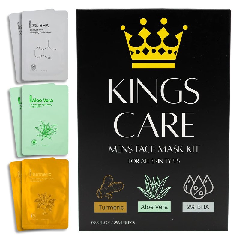 Kings Care Mens Face Mask Skin Care Kit (6 Pack) - Turmeric Anti-Acne, Aloe Vera Soothing & 2% BHA Salicylic Acid Sheet Mask - Skin Care for Men Face Masks for Hydrating, Brightening & Refining Pores