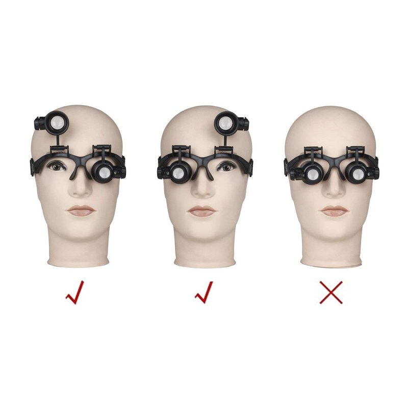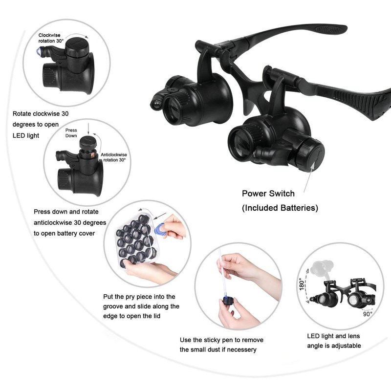 - Left right double eye watchmakers magnifying glasses magnifier loupe, with 2pcs adjustable LEDs to help it work in low-light conditions.