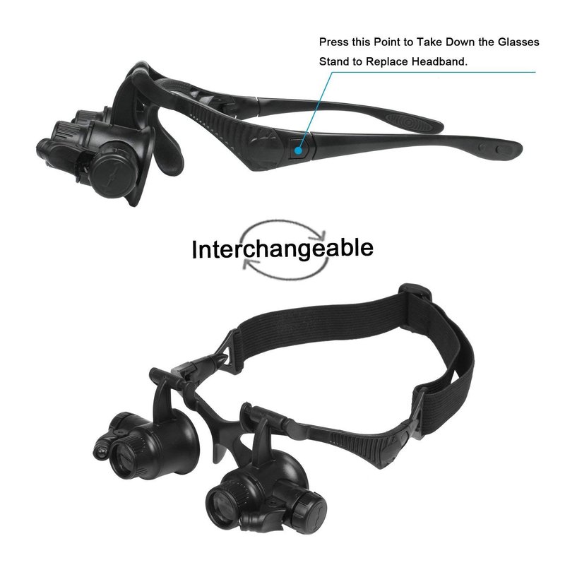 - 2 left/right magnifying eye patches with LED on the lens bracket. You may use two lens barrel alternately to eliminate visual fatigue and improve work effectively.