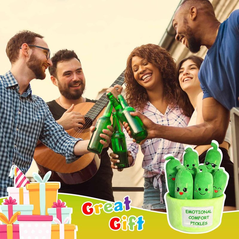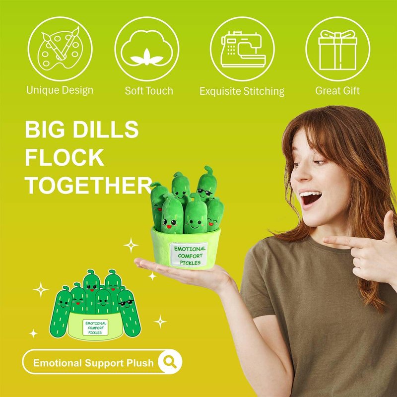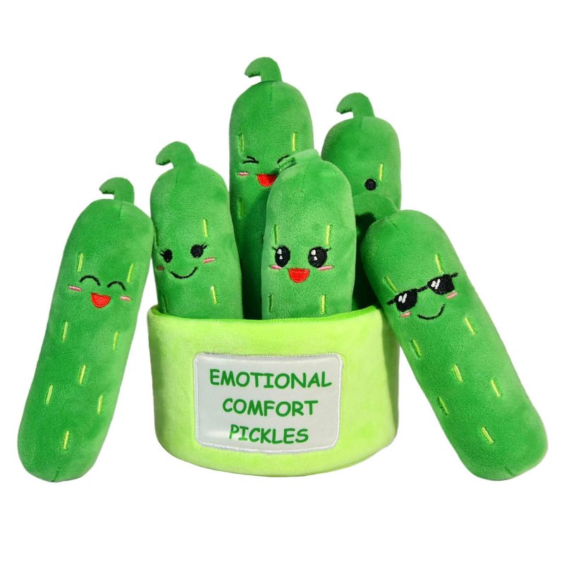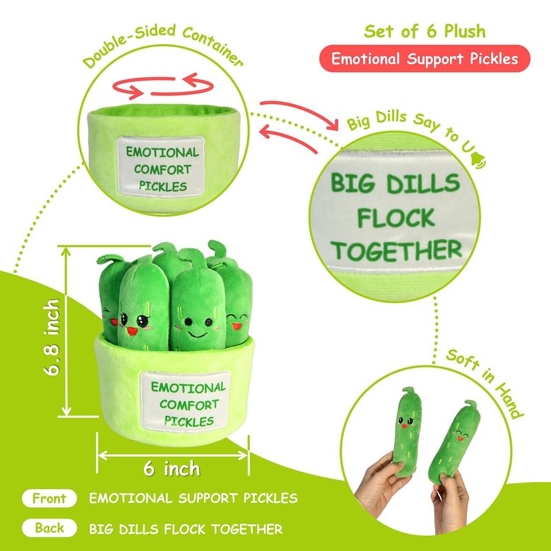 - Adorable Design: This set of 6 individual plush pickles, each with a adorable & funny expression, are placed in 1 plush container with positive phrases "EMOTIONAL COMFORT PICKLES" on the front & "BIG DILLS FLOCK TOGETHER" on the back.