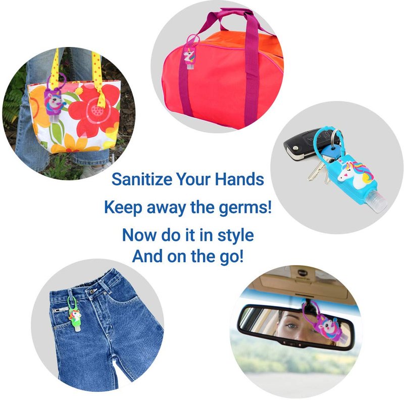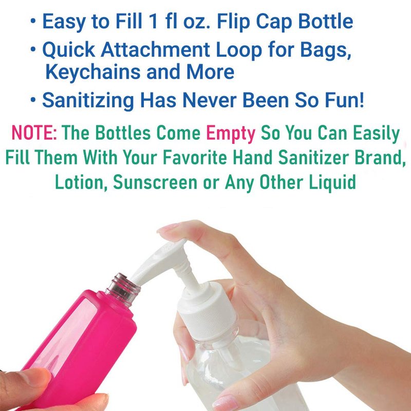 4 Pack 1 Oz. Hand Sanitizer/Lotion (Empty bottles) + 4 assorted lanyards. Silicone key ring cases and easy fill bottles. Uniquely Themed to appeal to your little ones to wash their hands voluntarily and frequently by making hand sanitizing FUN! Keeping Kids Hands Clea. is one of the most important steps we all can take to avoid them getting sick and spreading germs to others. Comes Empty : You Choose. We all have our preferred brands, simply purchase your favorite design and fill it with your choice of hand sanitizer, lotion, essential oils, skin lotion, gel products, shampoo and more. It’s that easy. Convenient to Carry on backpacks, key rings, purses, diaper bags or strollers. Perfect Little Gift for themed parties, Easter eggs, Birthdays, PTA student gifts, stockings stuffers and more! Flip cap bottles can be easily filled from any pump bottle, choose your design, choose your sanitizer!