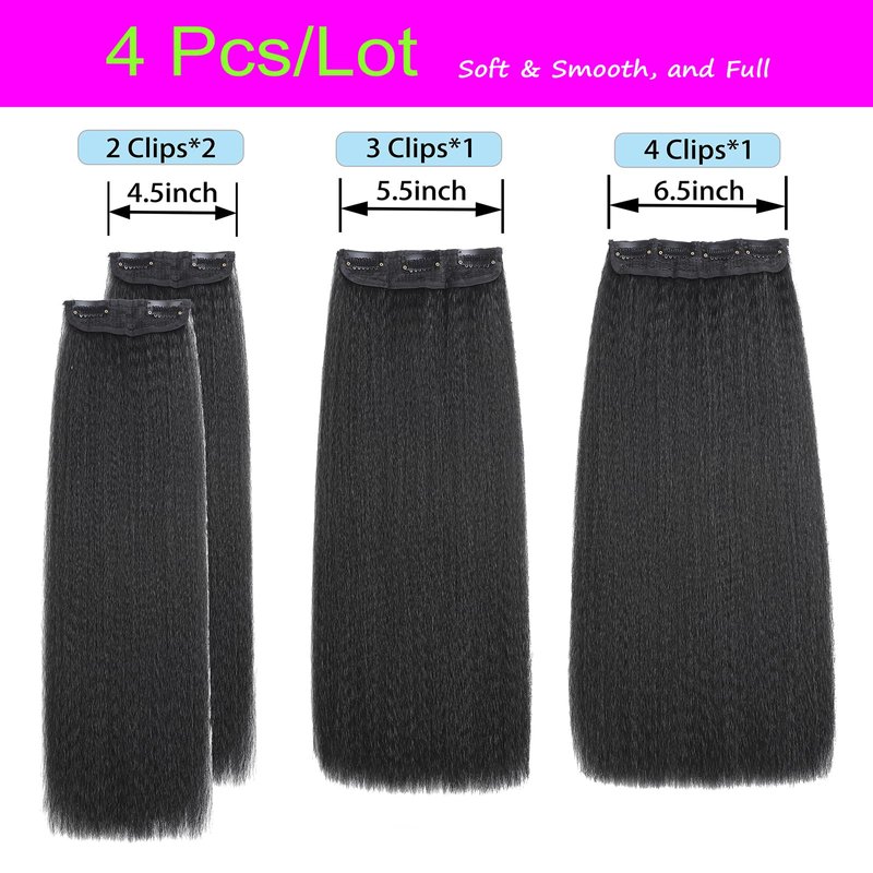 Kinky Straight Clip Ins Hair Extensions Natural Black for Black Women Full Head Yaki Kinky Straight Synthetic Hair 4Pcs 11 Clips 150g/Set (20 inch)