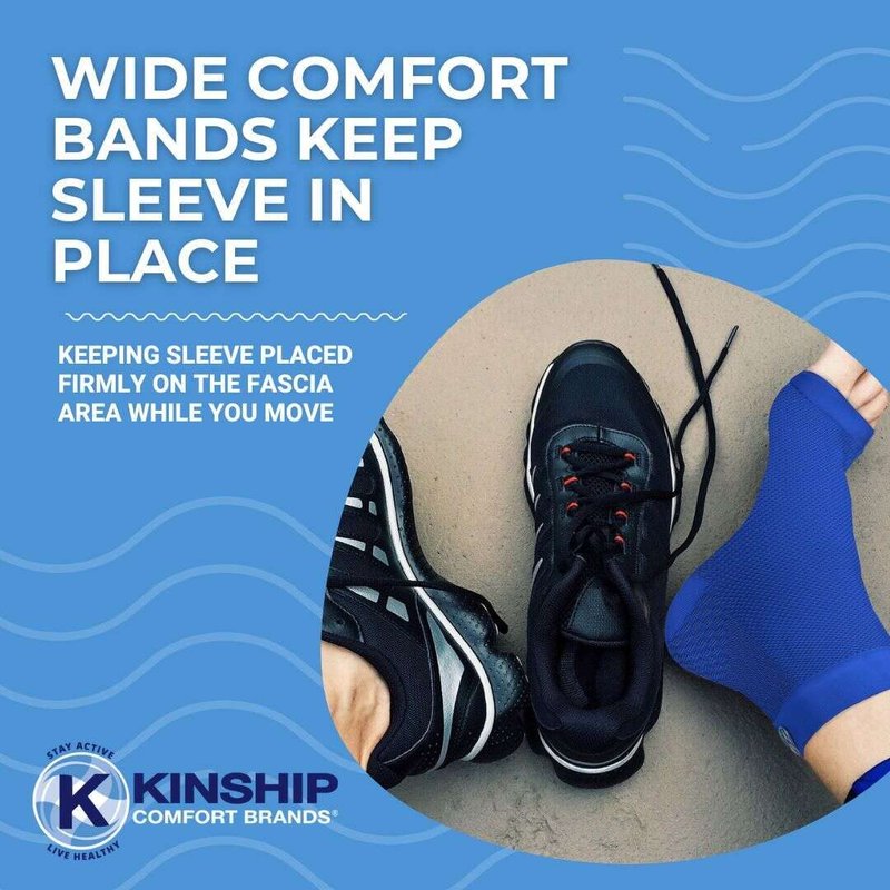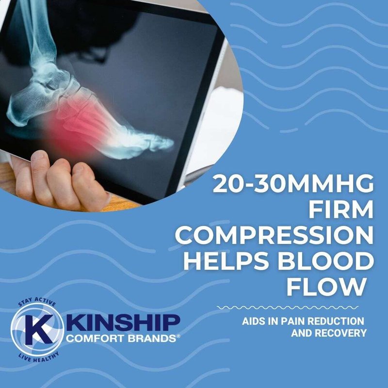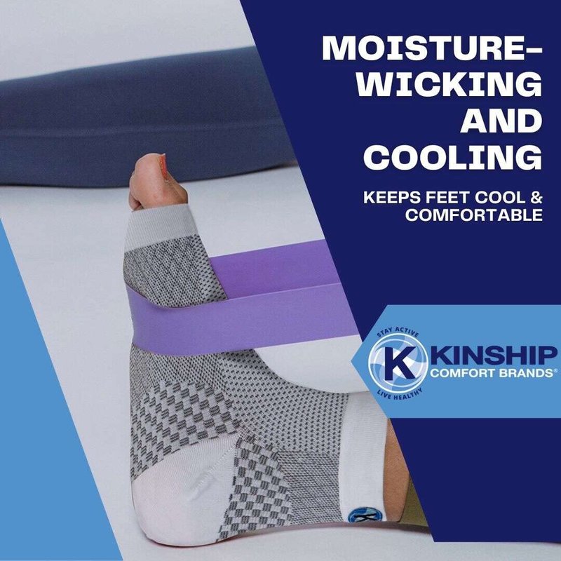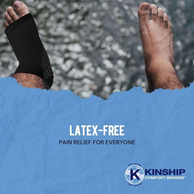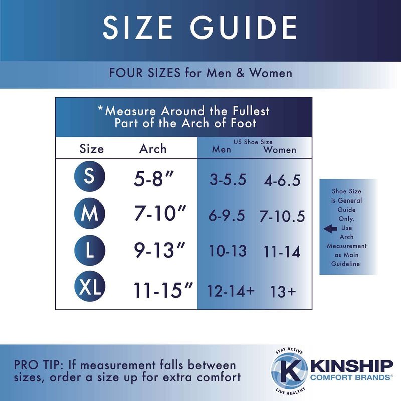 Kinship Comfort Brands Plantar Fasciitis Compression Socks provide pain relief by continuously lifting and stretching the Plantar Fascia avoiding more damage and minimizing the reoccurrence of Plantar Fasciitis. Supports tendons and joints needed to keep your feet healthy. Promotes blood flow to help rehab the plantar and achilles area. Four Sizes Designed for Men or Women. Available Sizes Small - 5" to 8" | Medium - 7" to 10" | Large - 9" - 13" | X-Large - 11" to 15". Our Plantar Fasciitis Sleeves are Engineered for Comfort & Fit Manufactured with moisture-wicking fabric that keeps you dry and comfortable during Sport, Leisure and Work activities. The wide comfort top and toe band help our plantar sleeve stay in place. Plantar Fasciitis Ankle Sleeve is engineered with microfiber nylon and spandex for a durable Plantar Fasciitis foot sleeve. High arch support bracing stretches the tendons in the Plantar Fascia and the Achilles region. Our Plantar Fasciitis ankle support brace is knit with 20 – 30 mmHg (firm support). Provides pain relief by continuously lifting and stretching the Plantar Fascia preventing more damage. Supports tendons and joints needed to keep your feet healthy. Promotes blood flow to help rehab the plantar and Achilles areaPlantar Fasciitis sleeves . Use this information to measure your foot to find your correct size. Measure around the ankle just above the ankle bone. If your measurement falls on the border of a size, buy the smaller size for added compression and the larger size for extra comfort. Our Plantar Fasciitis sleeves are available in small, medium, large, and x-large. Our Plantar Fasciitis Socks are perfect for Plantar Fasciitis Pain Relief. Support tendons and joints and keep your feet healthy. Our Ankle Sleeve promotes Blood Flow to help rehab foot injuries. Provides Arch Support and is the perfect compression sock for Achilles Tendon and Ankle Support.