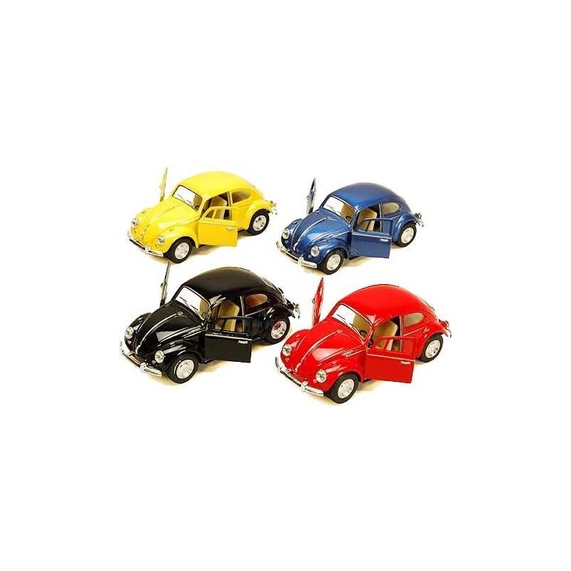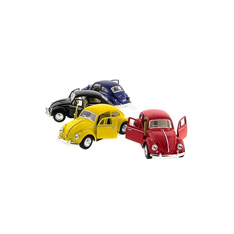 Set of 4 VW Classic Beetle 1/32 Scale (5 inches), Pull Back n Go Action. Color: Black, Blue, Red and Yellow.
