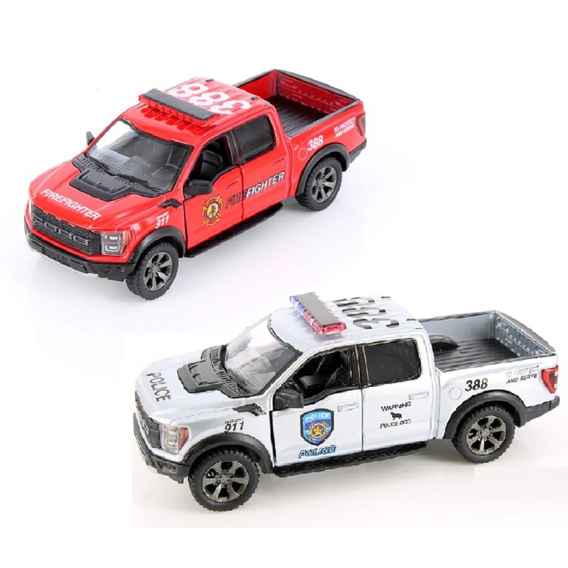 KiNSMART 2022 Ford F-150 Raptor Police & FIre Edition 2Set 5" 1:46 Scale Die Cast Metal MOdel Toy Trucks With Pullback Action, Two Opening Doors