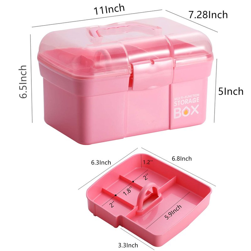 Kinsorcai 11'' Plastic Storage Box with Removable Tray, Multipurpose Organizer and Storage Case for Art Craft and Cosmetic (Pink)