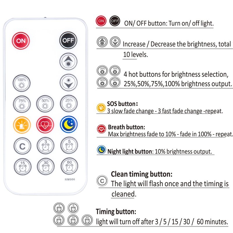 - RF Remote Control: 17-key RF remote controller with SOS mode, brightness adjustment, and more