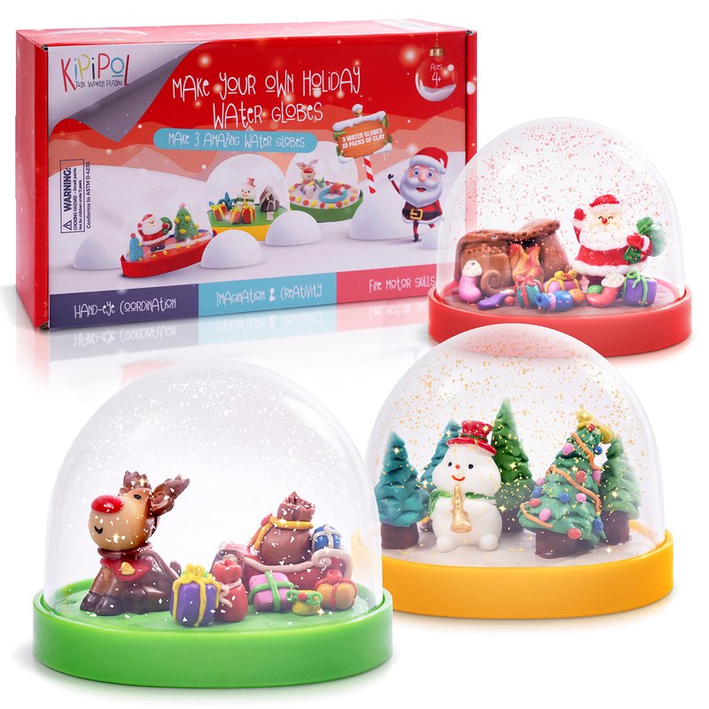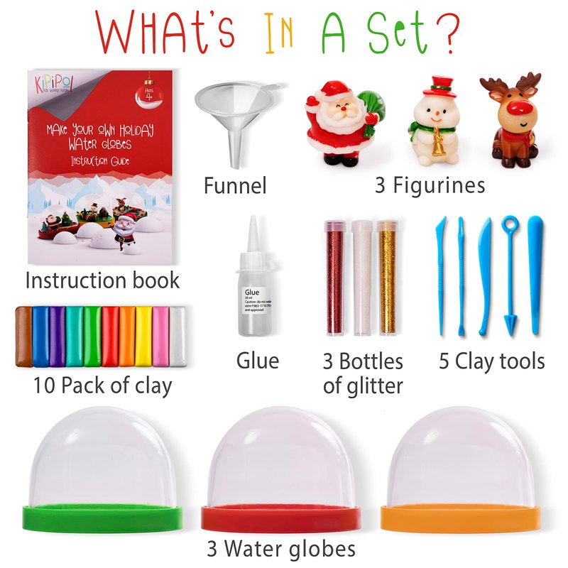 - ULTIMATE HOLIDAY SNOW GLOBES FOR KIDS: Kipipol snow globe Christmas kit has everything your kid needs to create 3 holiday water globes: 3 x figurines, 10 x soft clay packs (10g each), 3 x glitter bottles, 5 x modeling clay tools for kids, glue, and a detailed instruction book. This set makes perfect Christmas craft kit for kids 4-12