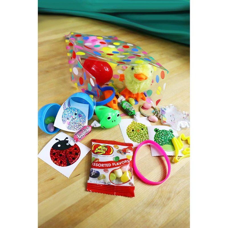 - Clear plastic bags with printed outside designs secure with silver twist ties, included.