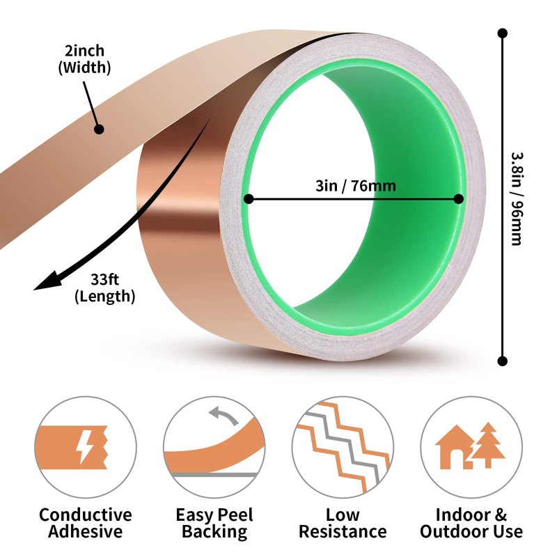 - Strong Adhesive - Kirecoo copper tape [2inch, 33FT], The copper foil tape conductive adhesive is super sticky and is protected with an easy peel backing which make it can be used on most surfaces & is able to withstand all weather conditions.