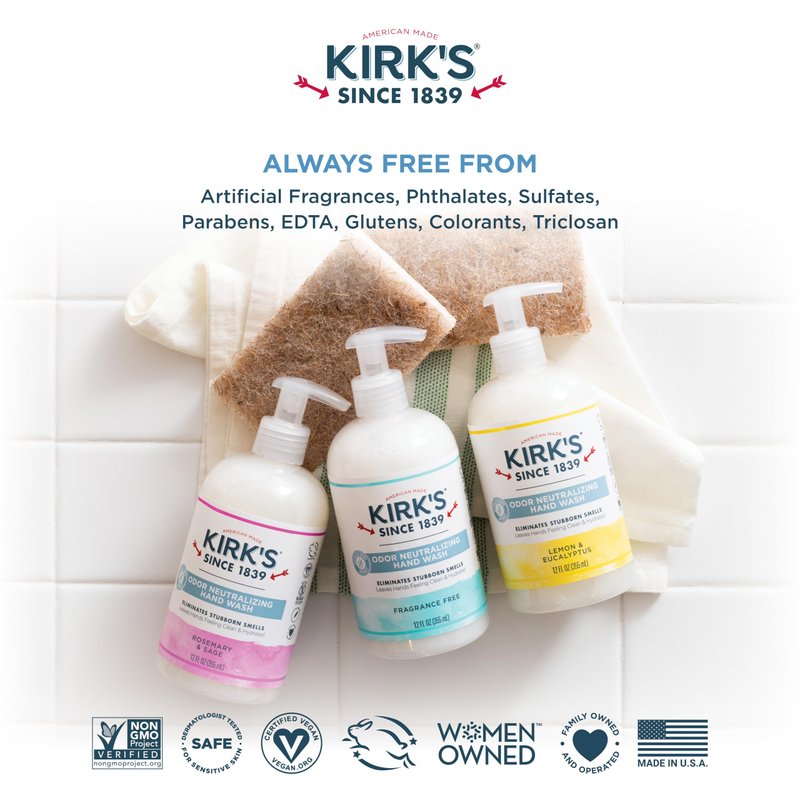 - SENSITIVE SKIN FRIENDLY Kirk’s odor-neutralizing hand wash contains no harsh chemicals or toxins that may dry or irritate your skin. Our natural formula is hydrating and safe for the most sensitive hands. Perfect as a kitchen hand soap, when hand washing is constant!