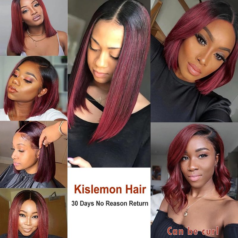Kislemon 1b99J HD Lace Front Wigs for Black Women 13x4 Deep Part Grade 10A Burgundy Straight Bob Human Hair Wigs 180% Density Pre Plucked Natural Hairline With Baby Hair 10 Inch