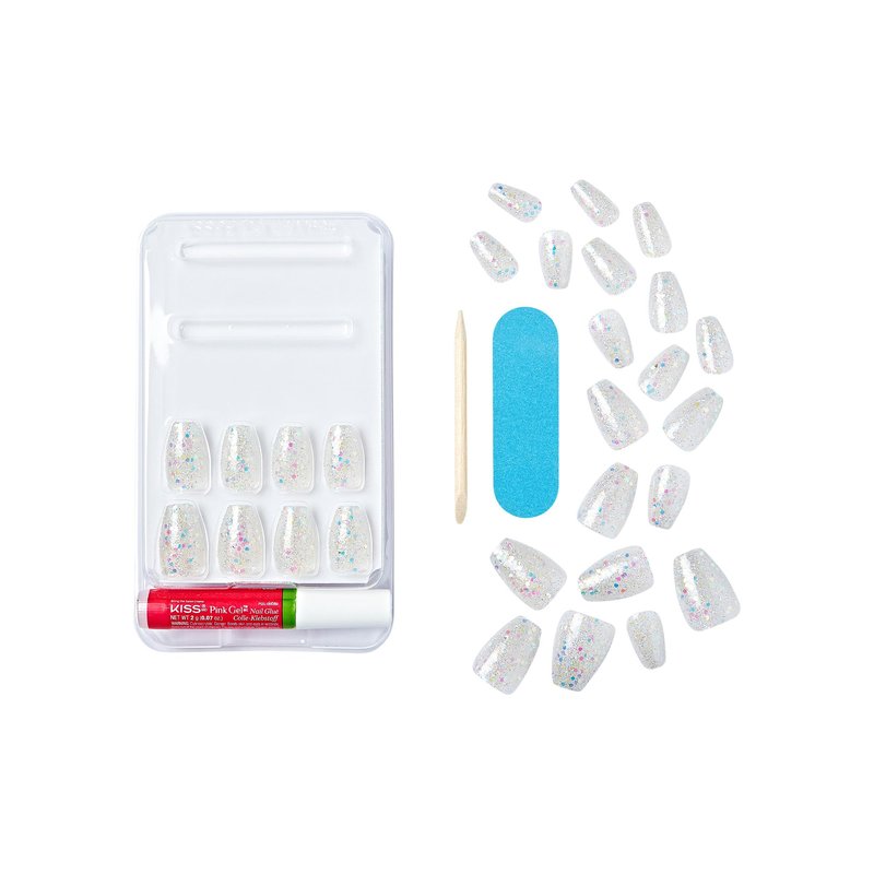 KISS Gel Fantasy Dreamdust, Press-On Nails, Nail glue included, Mood Dust', Light White, Short Size, Coffin Shape, Includes 28 Nails, 2G Glue, 1 Manicure Stick, 1 Mini File