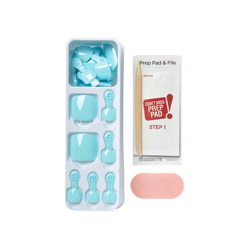 - Pedicure kit contains 24 press-on toenails, prep pad, mini nail file, and manicure stick