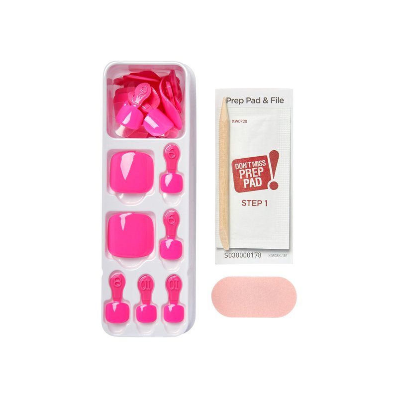 - Pedicure kit contains 24 press-on toenails, prep pad, mini nail file, and manicure stick