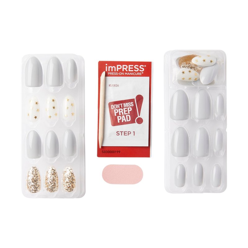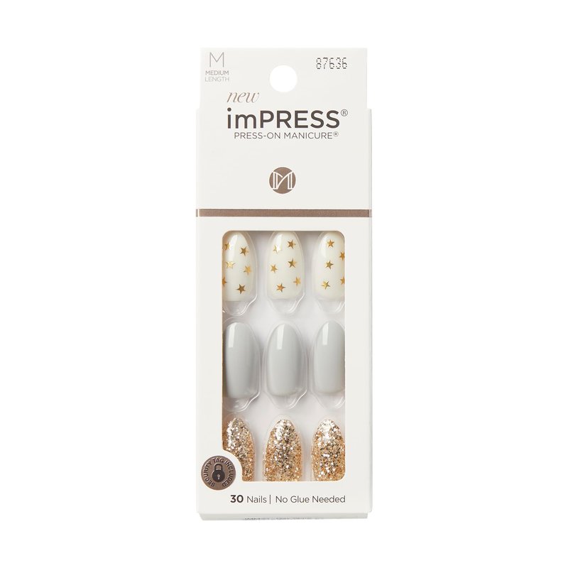 KISS imPRESS No Glue Press-On Nails White Gold Glitter Design Includes 30 Nails, Prep Pad, 1 Manicure Stick, 1 Mini File - Day Stars